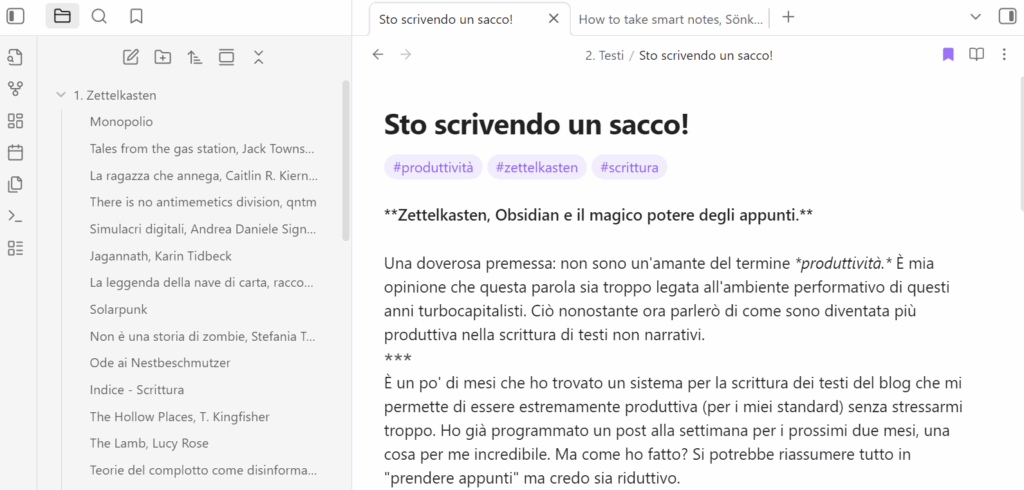 Come detto: il concetto di base è quello di avere un luogo dove stanno tutti i testi. E qui entra in gioco Obsidian. Si tratta di un programma di scrittura in markdown che permette di avere tutti i propri testi in un comodo menù laterale, ricercabili per parole chiave e linkabili tra di loro.